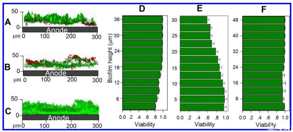 圖4。 不同電子受體呼吸的生物膜內(nèi)的活性分布。 A、 B和C分別是在CLSM下觀(guān)察到的莧菜紅呼吸生物膜、陽(yáng)極呼吸生物膜和同時(shí)莧菜紅和陽(yáng)極呼吸生物膜的垂直截面。 D、 E和F分別是基于莧菜紅呼吸生物膜、陽(yáng)極呼吸生物膜和同時(shí)莧菜紅和陽(yáng)極呼吸生物膜的CLSM結(jié)果的定量活性曲線(xiàn)。 低活性和受損膜的細(xì)胞呈紅色,而高活性和完整膜的細(xì)胞呈綠色。 0μm處的生物膜層為生物膜 ? 電極界面(底部)。