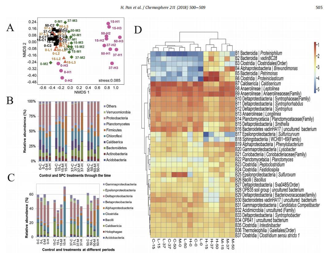圖3B、C和D顯示了門、類和屬級別的微生物群落的分類組成。在門級別(圖3B),微生物群落結構主要由九門組成。在H微觀世界中,擬桿菌和厚壁菌明顯促進并代表優(yōu)勢門,同時抑制鈣地霉、氯曲菌、酸性細菌和變形菌。在M微觀世界中,鈣質細菌和酸性細菌受到抑制。除了在第15天,L和C微觀世界中的氯屈曲增加和變形菌和鈣地霉減少外,L和C微觀世界顯示出相似的分布。圖3C顯示了相對豐度超過1%的類別。結果表明,在任何時候接受SPC處理的微觀世界中,鈣中毒都有所減少。在H微觀世界中,嗜酸桿菌、Holophagae、Caldiserica和Deltaproteobacteria急劇減少,而梭狀芽孢桿菌顯著增加。在M微觀世界中,α變形菌在第37天和第50天急劇增加,同時鈣質減少。