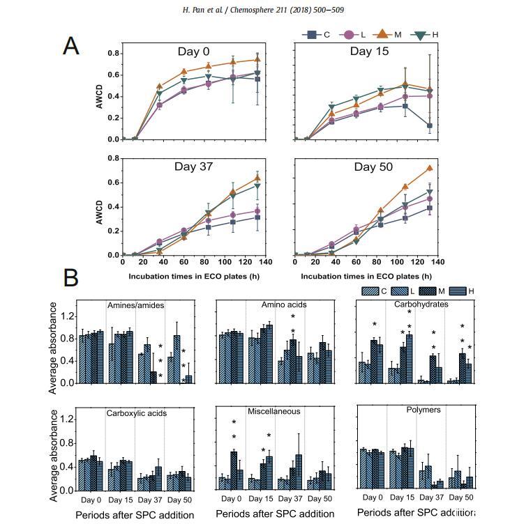 圖2。在不同時期(n?3),對照和SPC處理中所有六組碳源(b)的AWCD曲線(a)和潛在活性(b)。