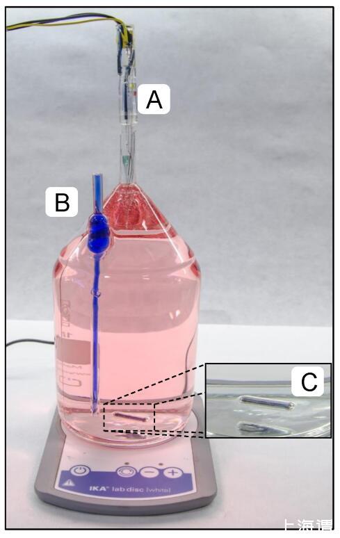 在實驗過程中,瓶子被置于黑暗中,浸泡在恒溫(15uC和21uC)的水浴中。使用2.5 cm長的玻璃涂層磁鐵(Fisher Scientific)(圖1 C)進行連續攪拌,同時將裝有瓶子的容器置于磁攪拌器(IKA)頂部。
