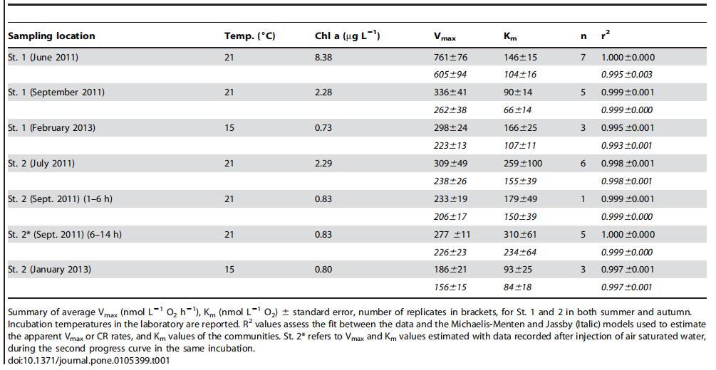 呼吸速率可能與水的預處理有關。這可以從第二次耗氧實驗(圖5和表1:St.2*,2011年9月,6–14小時)中對Km值的不同估計中看出。長期暴露于完全缺氧是應該避免的一個因素,因為它通常會導致非常不同的速率和Km值。此外,由于應允許社區適應新的條件,應丟棄孵化前1-2小時的數據[58]。建議使用2至16小時的數據確定動力學參數。超過16–20小時的孵化可能會導致高度錯誤的數據,至少在公海水樣中是如此(L.Tiano等人在準備中)[22]。
