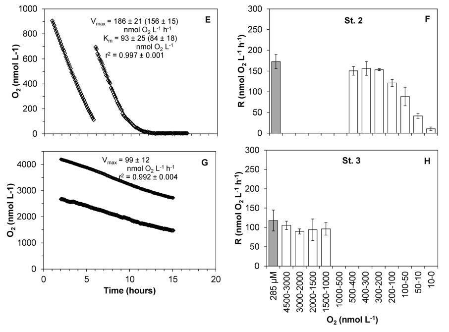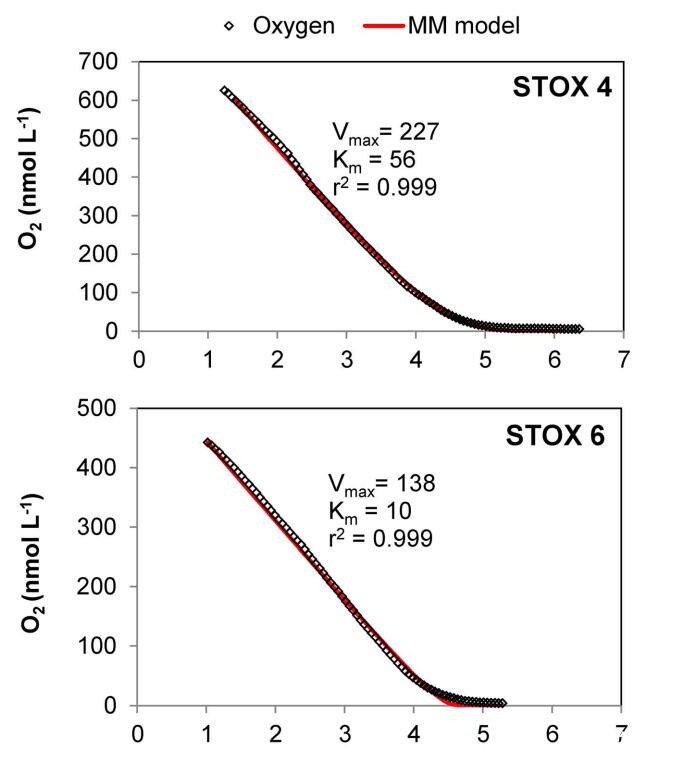 耗氧和隨后注入空氣飽和水后測定的表觀Km值與6月和9月St.1第一次耗氧曲線所得值相似。具體而言,對于6月的St.1,第一次消耗曲線的平均視在Km值6 St.誤差(n)為83611(3)nmol L-1 O2,在添加約1 mmol L-1 O2及其后續消耗后,視在Km值為118625(3)nmol L-1 O2。9月,注入約0.5 mmol L-1 O2后,表觀Km值首先為73625(3),然后為85626(3)nmol L-1 O2。然而,對于9月的St.2,第二次耗氧曲線導致表觀Km值從第一次運行的179增加到第二次運行的310 nmol L-1 O2(表1和圖5“STOX 7”)。
