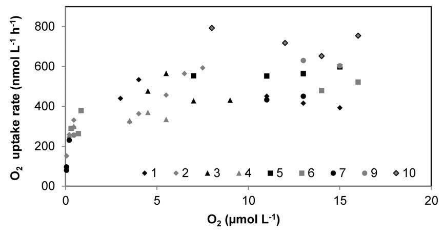 在氧濃度降低時,通過STOX傳感器法測量的呼吸率和在空氣飽和時通過溫克勒滴定法測量的呼吸率得出了類似的結果。事實上,這兩種方法記錄的氧氣吸收率大致相同,只要裝有STOX傳感器的瓶子中的氧氣濃度高于500-200 nmol L-1,這取決于不同的群體(圖6)。低于這些值時,呼吸速率取決于O2濃度,表明群落正在接近其表觀Km值。2013年冬季,對北海的St.1和St.2以及額外的St.3進行了方法比較,結果相似(圖6)。來自St.1、St.2和St.3的樣品暴露于2–0.5 mmol L-1的O2濃度下,其吸氧率與暴露于285 mmol L-1 O2的樣品相似(在標準誤差范圍內)。