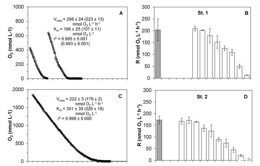 實驗2-方法在沿海水域的應用和比較。通過測量丹麥沿海水域3個不同站點和3個不同季節的CR率,對該方法進行了實驗測試,以覆蓋群落組成和代謝水平的最小變化。本研究的兩個主要站點(圣約翰海峽1號站和圣約翰海峽2號站,Marselisborg Marina,圖S1)分別于6月、7月、9月和1月取樣,并進行了三組反應堆試驗。由于我們的方法允許隨著時間的推移連續記錄氧氣濃度,因此我們能夠以高分辨率而非少量點監測和分析氧氣消耗過程(圖3)。因此,可以評估反應器中氧氣的減少是線性的,從高氧氣濃度下降到氧氣濃度#1 mmol L-1。在大范圍O2濃度的培養過程中,呼吸速率似乎與矩形雙曲線的一般形狀相匹配(圖4),并遵循Michaelis-Menten動力學。使用公式2(圖5)通過曲線擬合確定參數Vmax和Km。表1報告了三個研究期間St.1和St.2的估算Vmax值和表觀半飽和濃度Km。