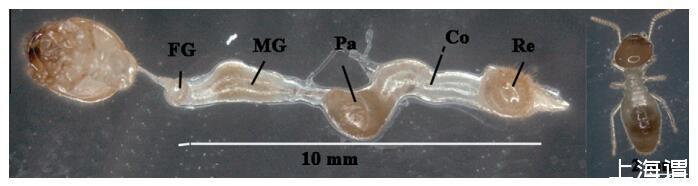 圖1。 臺(tái)灣白蟻工蟻離體腸道系統(tǒng)的形態(tài)特征。 圖中顯示的主要腸道腔室包括前腸(FG)、中腸(MG)、大腹便便(Pa)、結(jié)腸(Co)和直腸(Re),其中大腹便便、結(jié)腸以及直腸被歸類為白蟻消化道系統(tǒng)中的后腸。