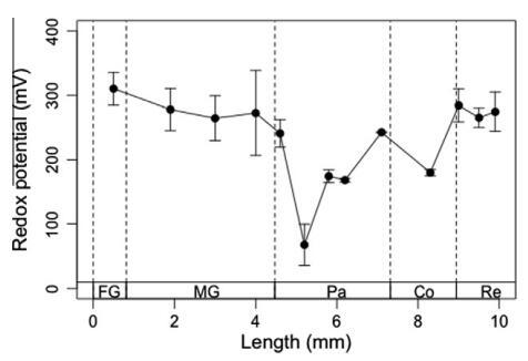 圖5。臺灣褐飛虱腸道系統(tǒng)軸向氧化還原電位分布。氧化還原電位數(shù)據(jù)記錄在腸道隔室的中心。剖面圖上的每個點代表五次單獨測量的平均值±SE。