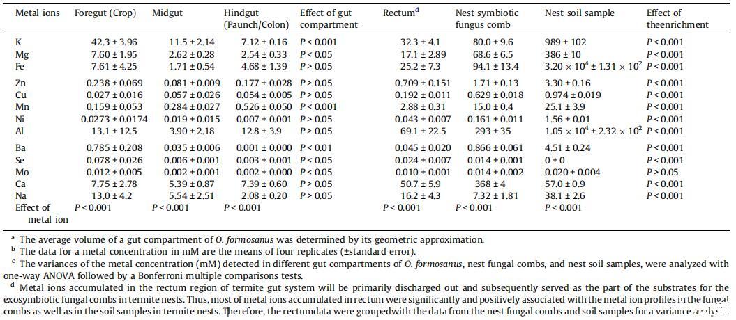 直腸區(qū)域是白蟻腸道系統(tǒng)的最后一個隔間,在維持金屬離子濃度平衡方面起著重要作用。任何累積的金屬離子,連同直腸中的其他未消化物質(zhì),最終會作為糞便排出消化道。這隨后成為巢穴共生體的獨特基質(zhì)。因此,在直腸、真菌梳和白蟻巢穴中的土壤樣本中,除鉬外,每種金屬都檢測到顯著的富集效應(P<0.001)。與臺灣褐飛虱前腸、中腸和腹部/結(jié)腸中的金屬離子分布相似,在直腸、巢穴共生真菌梳和白蟻巢穴土壤樣本中觀察到的每種金屬離子的豐度也顯著不同(P<0.001)。