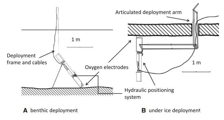 圖2氧氣微電極部署設(shè)備。相同的液壓微電極定位系統(tǒng)用于底棲(a)和冰下(b)部署。在冰下部署模式下,光、氧溫度和鹽度傳感器位于一起。在底棲部署期間,光傳感器保持在沉積物表面上方。視頻設(shè)備位于水工建筑物內(nèi)