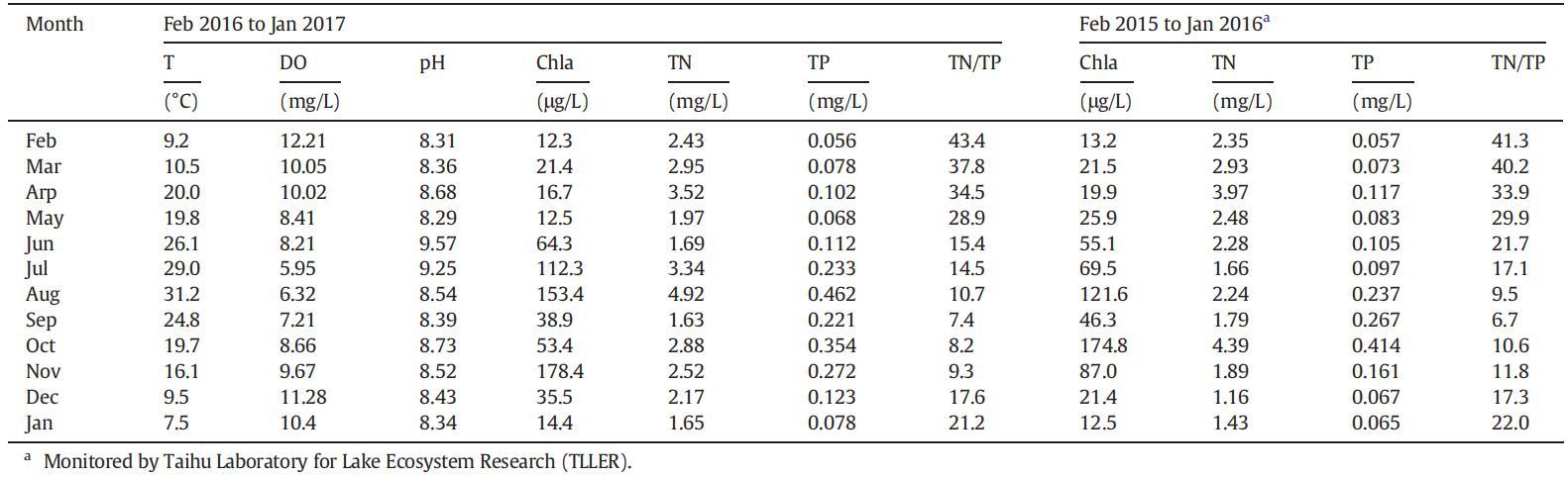 Chla濃度超過20和40μg/L被定義為水華,尤其是太湖有害水華(Xu等人,2015年)。在這項研究中,月平均Chla為56μg/L,反映出梅梁灣的赤潮造成了非常嚴重的危害(表1)。從2月到5月,葉綠素濃度保持在較低水平,只有3月的值超過20μg/L,這段時間被視為開花前階段。從6月到8月,Chla濃度急劇增加,濃度范圍極高(45–153μg/L),即確定為開花期。這段時間之后,9月份的葉綠素濃度急劇下降,然后在11月份迅速上升。在太湖和其他湖泊中觀察到了這種現(xiàn)象(Giles等人,2016年),這表明在9月出現(xiàn)了水華崩潰,然后在11月出現(xiàn)了晚季水華。