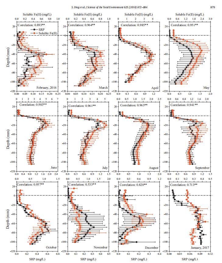 圖5。2016年2月至2017年1月太湖梅梁灣沉積物水剖面中可溶性活性P(SRP)和可溶性Fe(II)的月分布。所示數(shù)值為SRP和可溶性Fe(II)之間的相關(guān)系數(shù),雙星號表示pb 0.01水平的顯著性。