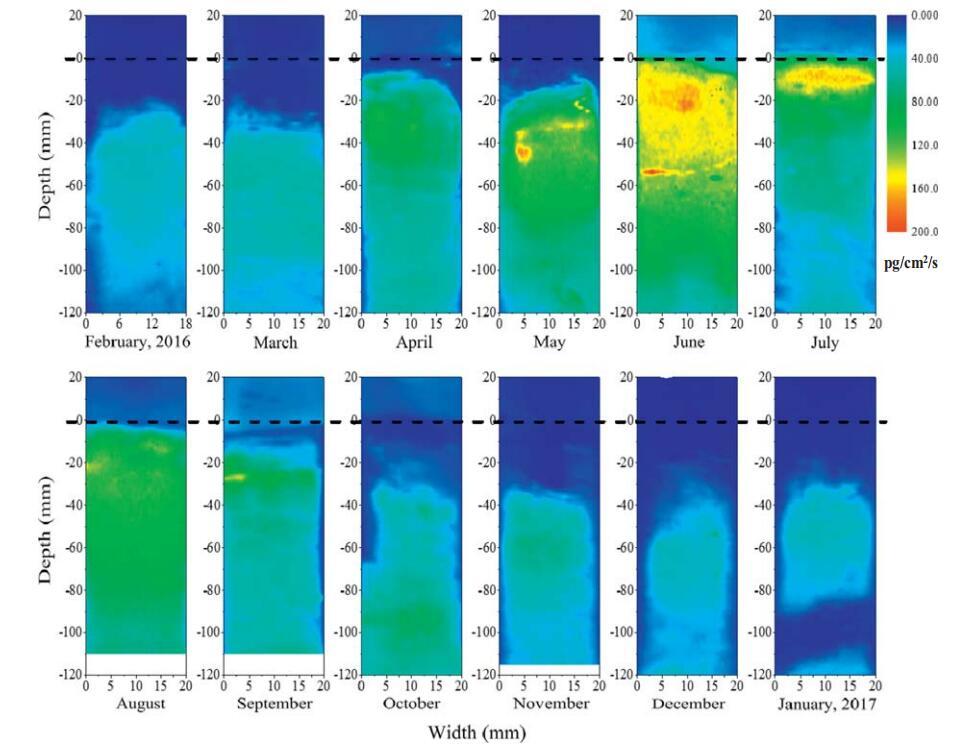 每個月的DGT不穩(wěn)定P(以DGT通量表示)的2D分布在亞毫米級進行成像(圖6)。很明顯,在2月份的整個剖面中,DGT通量相對較低,但在6月份之前,DGT通量呈上升趨勢,隨后在2017年1月之前呈下降趨勢。DGT通量在6月份最大,其次是7月份。同時,6月和7月的最高濃度高于其他月份,深度顯示最高濃度更接近SWI。