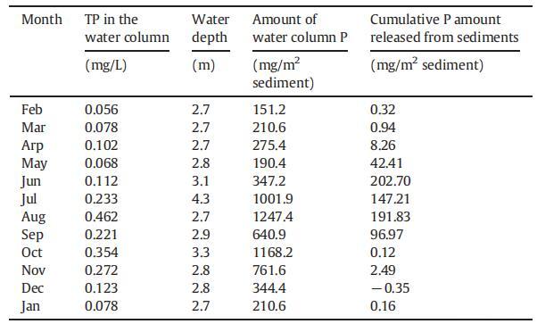 在本研究中,通過將SRP的擴散通量乘以月份內(nèi)的天數(shù),計算每個月每單位沉積物面積(m2)的P的內(nèi)部負荷質(zhì)量。還通過將TP濃度乘以水柱總深度,計算了每個月每單位沉積物面積(m2)水柱中TP的總質(zhì)量,結(jié)果見表4。每平方米水柱中的TP含量從2月的151.2 mg/m2增加到2016年8月的1242 mg/m2。2月至8月(開花前)水柱中總磷的總增加量為1091 mg/m2,而磷的內(nèi)部負荷質(zhì)量范圍為2月的0.32 mg/m2至6月的202.7 mg/m2。2月至8月,磷的總釋放量為593.6 mg/m2,占開花前水柱中觀察到的總磷增加量的54%。