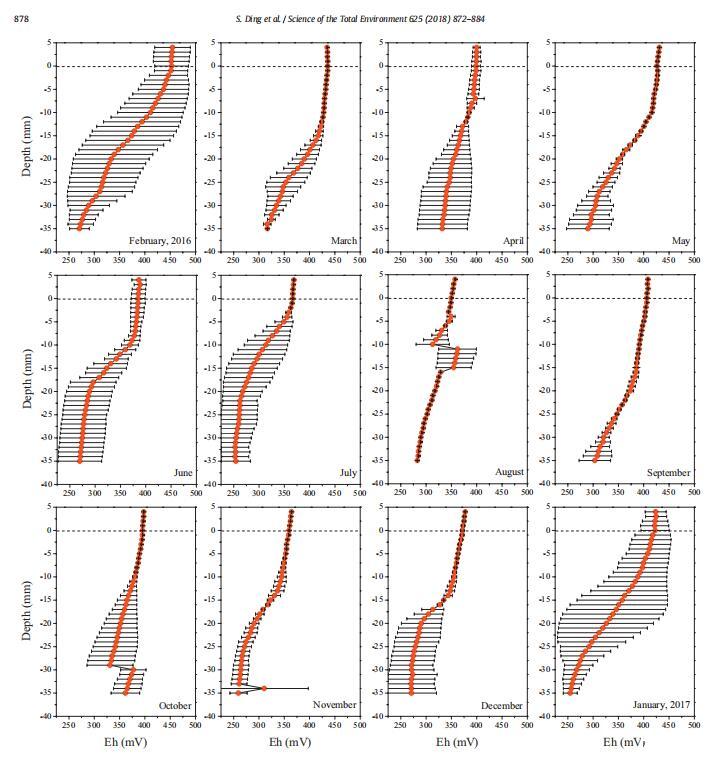 圖4。2016年2月至2017年1月期間每個月沉積物水剖面中Eh的垂直變化。數(shù)值為三次重復(fù)分析的平均值±標準差。