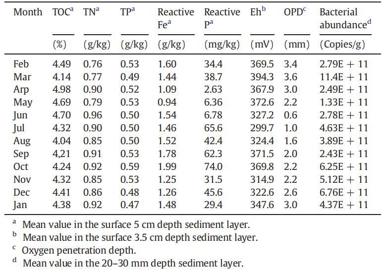 表2列出了基本的沉積物質(zhì)量特征。在表層沉積物中,TOC、TN和TP的濃度變化不大。在大多數(shù)采樣時間,活性鐵和磷的濃度顯示出相似的分布,從4月到5月,鐵的濃度和從4月到6月,P的濃度都非常低(圖2)。細菌豐度的濃度范圍為1.33E+11到11.4E+11拷貝,3月份的值明顯高于所有其他月份。OPD從6月的0.6毫米到2月的3.4毫米不等,6月到8月的OPD值相對較低(0.6到1.6毫米)(圖3)。Eh值隨沉積深度的增加而降低(圖4),3.5 cm表層的所有平均值均為N300 mv(表2)。