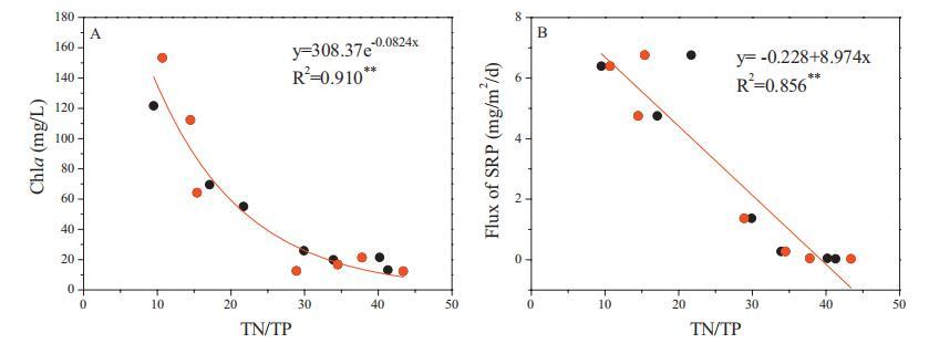 圖9。2015年2月至2017年1月太湖梅梁灣葉綠素濃度與TN/TP比值(A)和SRP通量與TN/TP比值(B)的關(guān)系。紅點和黑點分別顯示了2015年2月至2016年1月和2016年2月至2017年1月的數(shù)據(jù)。(關(guān)于本圖例中顏色的說明,讀者可參考本文的網(wǎng)絡(luò)版。)