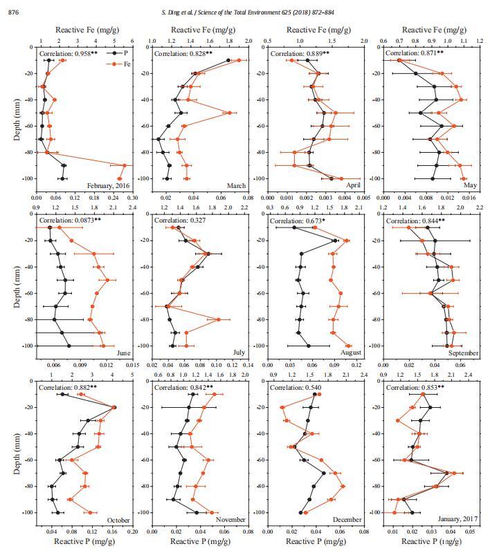 圖2。沉積物芯中活性磷和鐵濃度的垂直分布,每月從梅梁灣取樣,間隔10mm。結(jié)果表明,活性磷和鐵濃度之間存在相關(guān)性,在0.05水平下,顯著相關(guān)性用*表示,在0.01水平下,顯著相關(guān)性用**表示。數(shù)值為三次重復(fù)分析的平均值±標準差。