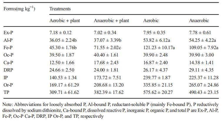 環境因子(DO和Eh)的變化影響土壤元素的積累。土壤磷形態的含量見表2和表3。小興凱湖濕地土壤有機磷和有機磷含量分別占總磷含量的50%左右。不同IP組分的減少順序為Fe-P>Al-P>Oc-P>Ca-P>Ex-P。不同處理之間的Fe-P、Ex-P或Al-P含量存在顯著差異,但Oc-P、Ca-P和DRP沒有顯著差異(表2和表3)。此外,我們還發現,在四種處理中,有氧條件下的磷形態含量最高。