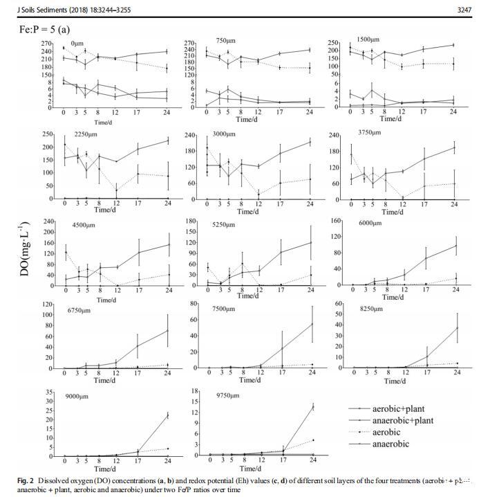 3.2不同鐵磷比下土壤元素的積累特征DO濃度分為三類:0-1500、2250-5250和≥6000,不考慮Fe/P(圖2a,b)。當深度小于1500μm時,所有四種處理的DO濃度都是穩定的。由于氧氣的引入,有氧組保持較高的DO濃度,其他兩組在4 mg L左右波動?1因為氮氣的引入。在2250和5250μm之間的深度,溶解氧濃度隨波動而增加。深度大于6000μm時,溶解氧濃度達到極限值(0.3 mg L?1),但在有氧條件下第12天后增加,表明深層土壤中的DO濃度降低,但隨著時間的推移迅速增加。土壤Eh值在兩種不同的鐵磷比之間差異很大。鐵磷比為5時,不同處理的土壤Eh值不同(圖2c)。好氧+植物處理的土壤Eh值向上波動,而厭氧+植物處理的土壤Eh值降至最低(第5天),然后緩慢上升,而對照處理的土壤Eh值則波動并下降。在鐵磷比為10的情況下,土壤Eh值通常先降低后升高(圖2d)。