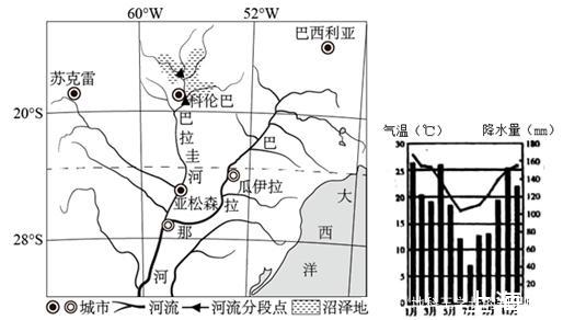 巴拉圭河是南美洲第五大河流,是巴拉那河的主要支流。科倫巴以上為中、上游,以下到與巴拉那河交匯處為下游。巴拉圭河上游位于起伏的巴西高原,中下游均位于低洼的巴拉圭平原,流域內(nèi)地表多為黏重的土壤。巴拉圭河中上游沿岸沼澤濕地為世界上最大的濕地,面積季節(jié)變化明顯,生物資源豐富。近年來,隨著人類過度占用資源,濕地被大量改造開墾,保護濕地成為迫在眉睫的問題。下圖為巴拉那—巴拉圭河流城圖和科倫巴附近氣候統(tǒng)計圖。