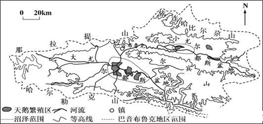 巴音布魯克濕地發(fā)育于天山山脈中部大、小尤爾都斯盆地中。盆地內(nèi)河流蜿蜒,流向區(qū)外。冬季嚴寒,年平均氣溫-4.7℃。巴音布魯克濕地內(nèi)有國家級天鵝自然保護區(qū),棲息著大量的野生天鵝。濕地周圍草場廣闊,是傳統(tǒng)的畜牧業(yè)區(qū)。20世紀中后期,出現(xiàn)過牧現(xiàn)象。同時,每年都有大量的畜群進入自然保護區(qū),嚴重干擾了天鵝的生存與繁衍。下圖為巴音布魯克地區(qū)示意圖。
