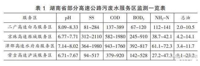 (2)污水以餐廚污水與公廁清洗污水為主,COD、BOD、SS、油類、氮、磷含量較高,受其產(chǎn)生量的影響,高速公路特征污染物濃度變化范圍較大,詳見表1。