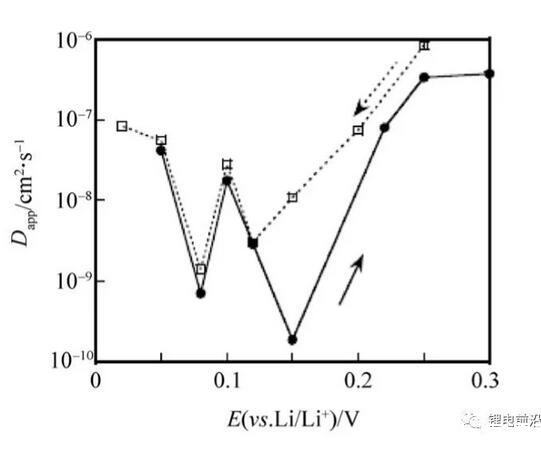 圖16人造中間相碳微球在不同電位vs.Li+/Li下表觀化學擴散系數