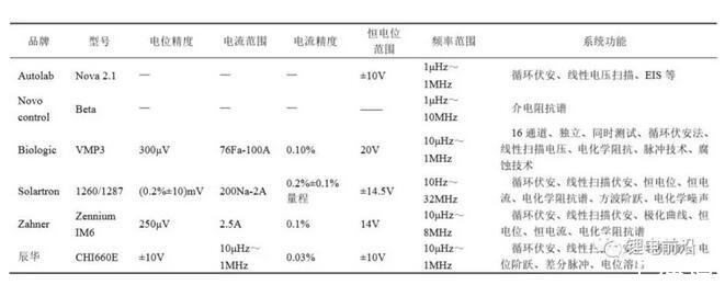 用于電化學阻抗譜測試的設備及用于數據擬合的軟件門類較多,如IM6、Solartron、Autolab、Novo control、辰華等;常見的用于EIS數據處理的軟件有Zview、ZSimpWin、EIS300、LEVMW、Impedance spectroscopy、Autolab Nova等。典型的用于EIS測試的電化學工作站其規格參數如表1所示。