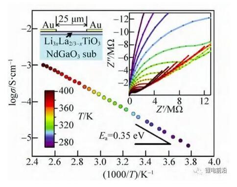 圖13和圖14分別展示了使用叉指電極和面內電極測試薄膜電解質LLZO和LLTO電導率的示意圖及變溫電導率曲線,其中圖14展示了使用面內工作電極測試LLTO電導率的阿侖尼烏斯曲線。圖14的測試結果顯示LLTO的電導率和溫度的關系很好的符合了阿侖尼烏斯關系式,由此可知,面內電極EIS測試可以很好的表征材料離子輸運和溫度之間的線性關系。