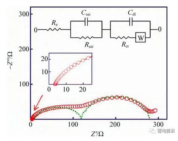 典型電化學阻抗譜,如圖2所示。主要包括隔膜、電極及集流體等歐姆阻抗,電子絕緣層SEI阻抗,電荷轉移阻抗,離子擴散阻抗及與晶體結構變化相關的阻抗幾個部分。通過電化學阻抗譜數據的解析可以定量或半定量的解析提取電池中的電極過程動力學信息。