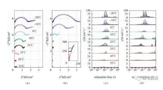 圖25石墨負極對金屬鋰電位在0.5V附近時,不同溫度下的阻抗譜,(a)顯示的第一周鋰化過程;(b)展示了第二周鋰化過程;(c)和(d)展示列了周和第二周鋰化過程的弛豫時間分布圖
