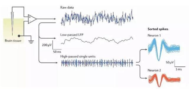 在神經(jīng)科學(xué)領(lǐng)域,研究者往往需要采集動(dòng)物腦內(nèi)的神經(jīng)電生理信號(hào),即神經(jīng)元放電產(chǎn)生的動(dòng)作電位,或神經(jīng)核團(tuán)眾多神經(jīng)元電活動(dòng)形成的局部場(chǎng)電位。比如說(shuō),在動(dòng)物執(zhí)行工作記憶任務(wù)時(shí)采集動(dòng)物前額葉皮層的神經(jīng)電信號(hào),以此來(lái)研究工作記憶的神經(jīng)機(jī)制。那么問(wèn)題來(lái)了,如何才能采集或檢測(cè)到動(dòng)物腦內(nèi)的神經(jīng)電信號(hào)呢?這里研究者就需要借助于神經(jīng)微電極,神經(jīng)微電極采集顱內(nèi)神經(jīng)電信號(hào)的示意圖如下所示。