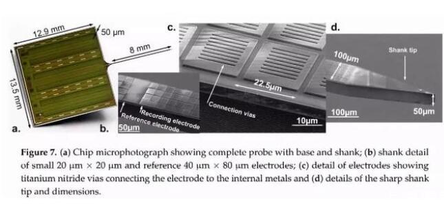 此外,由比利時(shí)魯汶大學(xué)的Bogdan團(tuán)隊(duì)研制的NeuroSeeker電極把神經(jīng)微電極的空間分辨率做到了極致[3]。NeuroSeeker電極為寬100 um,長(zhǎng)8mm的針狀,其上分布有多達(dá)1356個(gè)神經(jīng)電信號(hào)采集位點(diǎn),可最大化地實(shí)現(xiàn)高空間分辨率的神經(jīng)電信號(hào)采集。