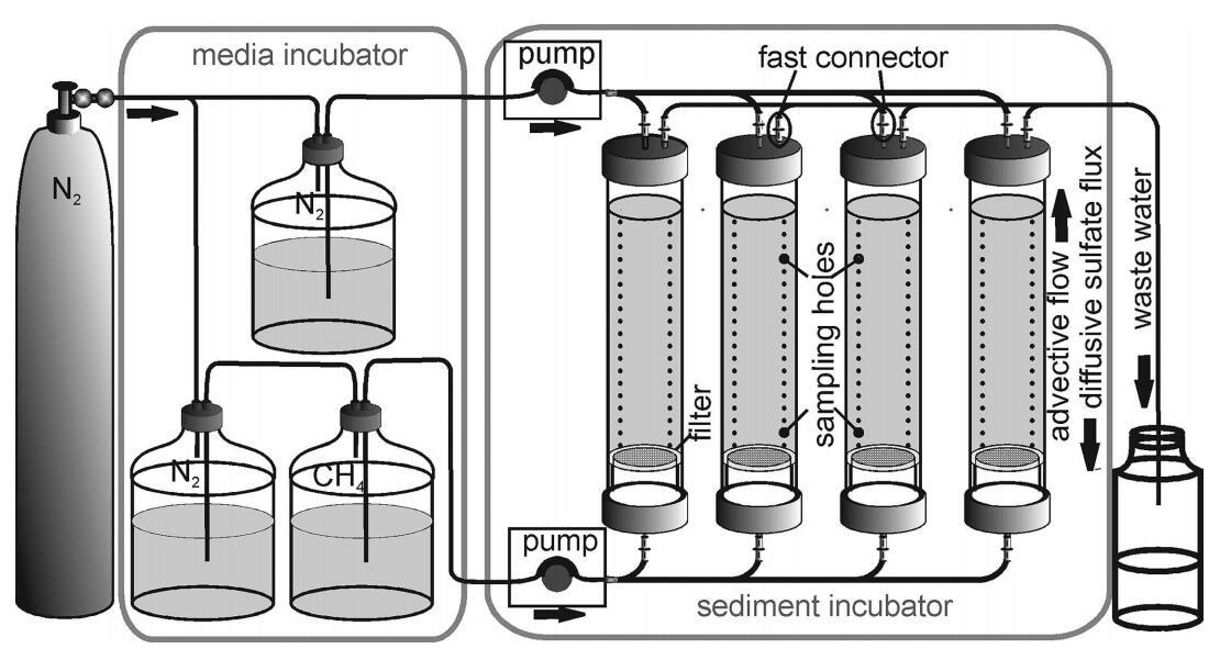 圖2:。插槽系統示意圖。將培養基儲液罐儲存并在10°C的冰箱柜中冷卻。培養基從頂部進入堆芯,模擬缺氧海水。富含甲烷但不含硫酸鹽的下部介質從底部進入巖芯,模擬流體滲流。CH4儲層中的滲流介質富含甲烷。所有介質均通過泵和管道輸送。所有磁芯均配有快速連接器,以避免斷開時空氣侵入,并配有三行21個硅密封孔用于取樣。沉積物芯下方的玻璃纖維過濾器防止沉積物流失到槽系統的下部。流出的廢水(頂部)收集在一個瓶子中。