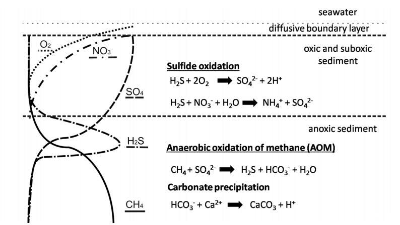 圖1:。冷泉特征生物地球化學過程示意圖。電子受體氧(虛線)、硝酸鹽(寬虛線)和硫酸鹽(虛線)的滲透。甲烷(實線)與滲流流體平流。硫化物(緊密虛線)和碳酸氫鹽是由甲烷的厭氧氧化(AOM)產生的,由甲烷營養古菌和硫酸鹽還原菌聯合體介導。自生碳酸鹽沉淀,硫化物被化能自養生物氧化。