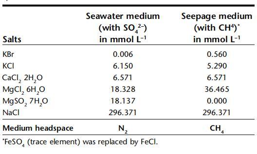 表2:。槽系統中使用的兩種不同介質的鹽濃度。含硫酸鹽的海水介質從頂部輸送,含甲烷的滲流介質從底部輸送,不含硫酸鹽。在最后一行中,表示介質頂部空間的氣體。