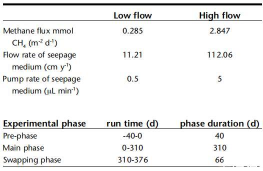 在巖芯頂部,用20μL min–1的泵將海水介質永久泵入上覆水中,以確保恒定的硫酸鹽濃度和硫酸鹽擴散到沉積物中。運行310天后,交換兩個巖心的流速,以研究AOM對流速快速變化的反應。表3給出了運行時和流量的概述。如上所述,每隔1-2個月對流出、流入和垂直取樣孔進行二次取樣/測量。