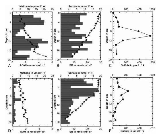 圖9:。切片后(376天運行時間)新高流量巖心(NHFC;A-C)和新低流量巖心(NLFC;D-F)中的生物地球化學參數。顯示了甲烷(A、D、cross)、硫酸鹽(B、E、cross)、硫化物(C、F、dots)的孔隙水剖面,以及AOM(A、D、bars)和硫酸鹽還原(SR)(B、E、bars)的放射性示蹤物測量結果。