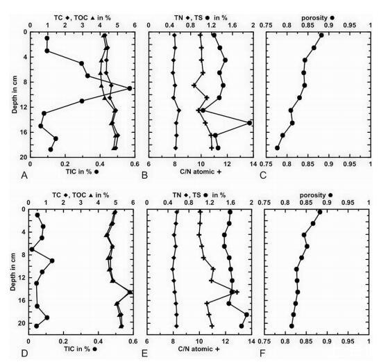 圖10:。在新高流量巖心(NHFC;A-C)和新低流量巖心(NLFC;D-F)的沉積物巖心中測得的沉積物固相參數:(A和D)總碳含量(TC)、總有機碳含量(TOC)、總無機碳含量(TIC),單位為干重的%w/w;(B和E)總氮(TN)、總硫(TS),以干重的%w/w表示,C/N比;(C和F)沉積物的孔隙度。