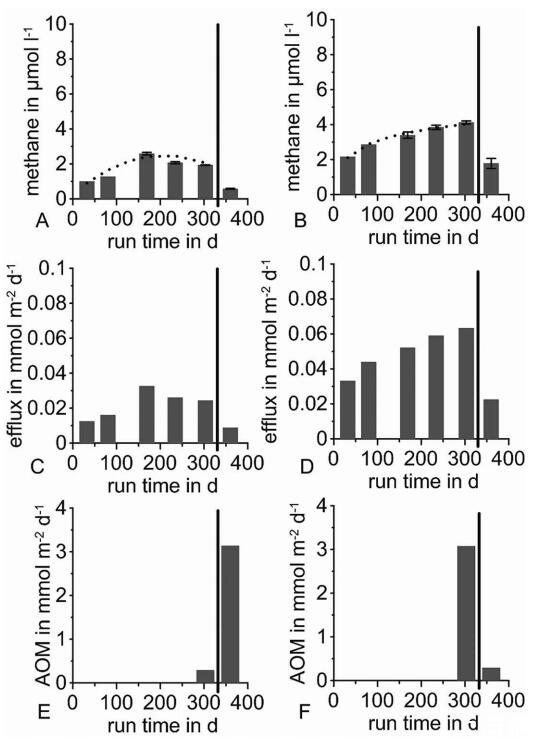 圖7:。交換前后系統流出(A,B)中的甲烷濃度(μmol L–1)、甲烷流出(mmol m–2 d–1;C,d)和AOM速率(mmol m–2 d–1):(A,C,E)來自埃克恩費爾德灣的低流量堆芯(LFC)和(B,d,F)高流量堆芯(HFC)。垂直線標記流體流量交換的時刻(低流量→高流量,反之亦然)。誤差條(A,B)表示三次重復氣相色譜測量的標準偏差;前兩個數據點代表單個測量值。點-ted線代表交換前甲烷濃度發展的趨勢線(低流態:5×10–6×truntime2+0.02 truntime+0.285,r2=0.825;高流態:0.8576×ln(truntime)-0.8662,r2=0.987)。
