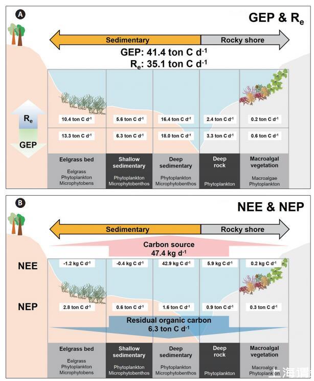 沿海碳循環(huán)的概念圖,將生態(tài)系統(tǒng)生產(chǎn)和NEE沿著各種類型的亞生態(tài)系統(tǒng)進(jìn)行,如圖4所示,在局部方格范圍內(nèi)(約30 km2)。整個光洋灣系統(tǒng)通過GEP共吸收41.4噸無機(jī)碳,并通過Re向沿海水域釋放35.1噸CO2(圖4A)。具體而言,深部沉積區(qū)的GEP最高,為18.0噸C d-1。盡管鰻草床只占據(jù)了一小部分區(qū)域,但與深層沉積棲息地(13.3噸C d-1)相比,該系統(tǒng)占海灣局部箱型規(guī)模GEP的73%。大型藻類植被的GEP、NEP和Re最低(分別為0.6、0.3和0.2噸C d-1),可能是因為大型藻類棲息地占據(jù)了海灣面積的最小比例。在亞生態(tài)系統(tǒng)中,鵝草床的NEP最高(2.8噸C d-1)。因此,這個海灣系統(tǒng)大約有6噸碳,根據(jù)NEP可能被固定為有機(jī)物,部分光合有機(jī)碳可能被隔離到外海。此外,據(jù)NEE估計,約47千克CO2從海水排放到大氣中。