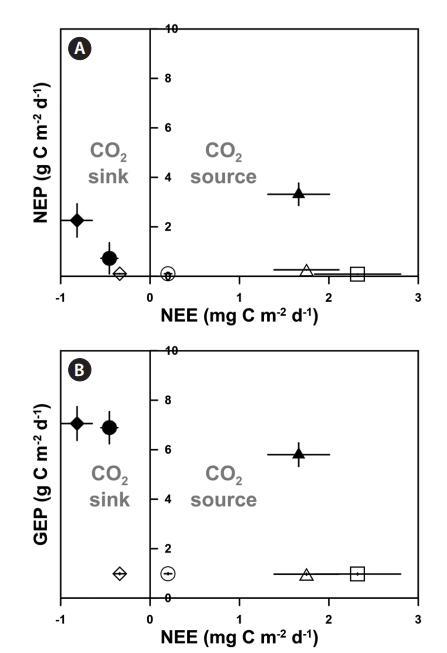 圖3:。兩個鵝草床的凈生態(tài)系統(tǒng)產(chǎn)量(NEP)(A)和總生態(tài)系統(tǒng)產(chǎn)量(GEP)(B)與海氣界面CO2交換(凈生態(tài)系統(tǒng)交換,NEE)的比較(◆,EG1;●,EG2),大型藻床(▲,AG),淺層沉積區(qū)(◇,EG1輸出;○,EG2 out),深層沉積區(qū)(□),和深部巖石區(qū)域(△,2007年6月20日至7月20日(31天)。所有值均表示為平均值±標(biāo)準(zhǔn)誤差。