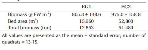 在鰻草床EG1,估計地上鰻草生物量為805.3±138.6 g FW m-2。2007年6月,預(yù)計鰻草覆蓋面積和總生物量分別約為15960 m2和13濕噸(表1)。在eelgrass河床EG2,平均地上eelgrass生物量估計為975.0±158.8 g FW m-2,eelgrass覆蓋面積和總生物量估計分別約為52800 m2和51濕噸。