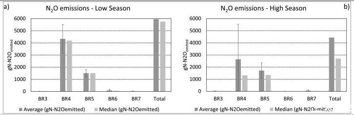 圖2、a)LS(淡季)和b)HS(旺季)期間反應器的N2O排放。從圖中可以看出,在淡季發(fā)現(xiàn)了較高的總N2O排放量。生物反應器4(BR4)對污水處理廠N2O總排放量的貢獻最大,其次是BR5,缺氧區(qū)(BR3和BR6)和最終好氧區(qū)(BR7)在兩個季節(jié)的貢獻均不顯著.旺季總排放量減少的主要原因是BR4的N2O排放率較低。