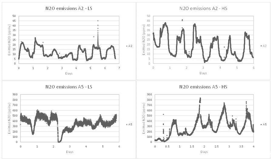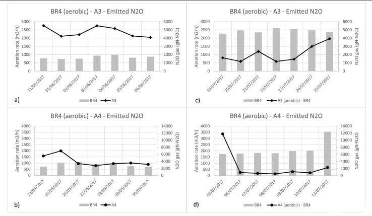 圖3、BR4淡季(LS)采樣位置a)A3和b)A4和BR4(HS)旺季采樣位置c)A3和d)A4的N2O排放和曝氣率比較。N2O排放的主要貢獻者是兩個季節(jié)的BR4,該反應器中排放的每日動態(tài)(加上曝氣率)。HS期間的排放量低于LS期間。在LS期間,與HS相比,排放更不穩(wěn)定。