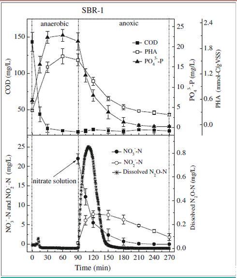 圖2、SBR-1反應器中COD、PHA、PO43--P、NO3--N-、NO2-N以及溶解性的N2O變化趨勢。從圖中可以看出SBR主要進行反硝化脫氮和除磷反應。厭氧階段。COD在30分鐘內降低到最低水平,并且伴隨著糖原的分解,PHA的合成以及PO43--P的釋放。缺氧階段主要進行硝酸鹽的降解,以及憐酸鹽的吸收;并且伴隨著的分解和糖原的合成。而N2O的產生主要發生在的缺氧階段,厭氧階段兒乎沒有的產生;一旦KNO3溶液加入到反應器中,溶解性的濃度迅速增加,并在缺氧反應第15分鐘到最大值0.87mg/L,隨后溶解性的N2O濃度逐漸降低到0mg/L。