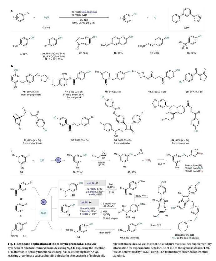 Josep Cornella教授課題組將N2O作為綠色氧源,利用有機金屬Ni配合物活化N2O,在溫和條件下成功地將一系列芳基鹵化物高選擇性地轉化為高價值的酚類化合物。這種獨特的有機金屬C-O鍵形成不同于當前基于還原消除的策略,并為芳基鹵化物轉化為酚類化合物提供了新方法和新借鑒。