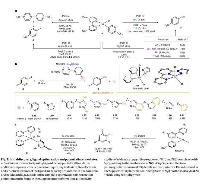 根據前人的研究成果:N2O可以與某些膦-Ni(II)配合物反應(Organometallics1995,14,456-460;J.Am.Chem.Soc.1993,115,2075–2077.)。作者合成了氧化加成產物4,并研究了其與N2O的反應性(Fig.2a)。結果表明:在氬氣氛圍下溶解于DMA中,4發生分解主要生成自偶聯產物5以及痕量的脫鹵產物6(path a),在Zn等還原劑的存在下,會加速4的分解(path b)。將氬氣換成N2O時,4的溶液的亮紅色仍然存在,表明分解速率變慢。經過酸處理后,酚7的產率為15%(path c)。在此基礎之上,向反應體系里添加Zn做還原劑,可提高7的產率,尤其是添加Zn和NaI的組合時,7的產率可提高至73%(path d)。隨后作者對配體進行了篩選發現聯吡啶2-位取代的三齒氮化配體對催化活性至關重要,其中三聯吡啶(L18)和6-吡唑基-2,2'-聯吡啶(L50)效果最好(Fig.2b)。用C-H或S取代N原子會抑制催化活性(L48和L61);吡唑單元的N旁邊的空間位阻也會抑制催化活性(L55和L58);吡唑上的缺電子取代基會顯著降低酚的產率。為了證明反應中的Ni-ligand的參與,作者制備了配合物10并對其進行了結構表征,使用10作為催化劑,得到酚9(75%),因此證實預配合物具有催化能力。然而,盡管鄰位中存在兩個Me基團,但在Zn和NaI存在下,反應后用酸性處理后以49%的產率提供了所需的mesitol(12)。為了進一步證明Ni(I)-C(sp2)參與反應,作者將(tBu-terpy)Ni(I)-I(13)與Ph2Zn在N2O下進行了反應,觀察到20%的酚(14)的生成。這些發現表明,Ni(II)物種被還原為Ni(I),以及碘鹽對C(sp2)-O的形成鍵非常重要。