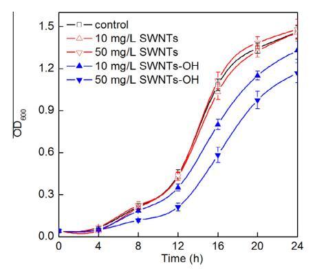 圖6.單壁碳納米管和單壁碳管OH對反硝化細菌生長曲線的影響。誤差條表示三次測量的標準偏差。
