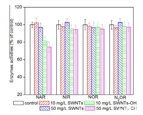 圖7.在24小時的實驗時間,單壁碳納米管和單壁碳管OH對硝酸還原酶(NAR)、亞硝酸鹽還原酶、一氧化氮還原酶和氧化亞氮還原酶活性的影響。誤差條表示三次測量的標準偏差。