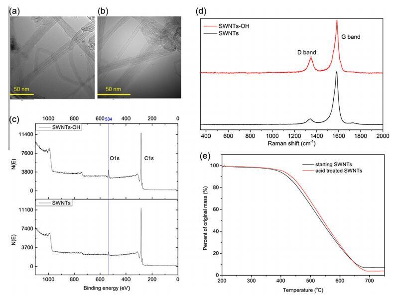 圖1.通過各種技術對單壁碳納米管和單壁碳管OH樣品的表征。(a)單壁碳納米管的TEM圖像;(b)單壁碳納米管OH的TEM圖像;(c)SWNTs和SWNTs OH的XPS光譜(534eV是氧元素的對應位置)。(d)G-帶歸一化后的單壁碳納米管和單壁碳管OH的拉曼光譜。(e)酸處理前后單壁碳納米管的熱重分析以及最終穩定質量百分比是由于金屬催化劑的存在。